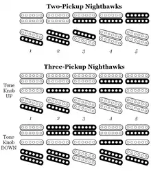 The five-position knife switch common to all Nighthawks provides five tone settings (or pickup combinations), but on the three-pickup models, the tone knob includes a push-pull feature that provides access to a second set of five, for a total of ten tones. It is often said that when the knob is pulled out, the humbuckers' coils are split, but this is somewhat misleading. All Nighthawks have a mixture of humbucking and split-coil tones whether or not they have the push-pull feature. On the two-pickup models, only positions two and five use both coils of the same pickup; the other three positions are split-coil.[8] On the three-pickup models, one or both humbuckers are split in positions one, two, four, and five with the tone knob pulled up, and in position five with the tone knob pushed down.[9] (See the graphic at right.)
