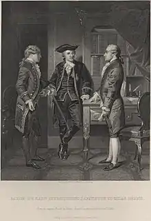 In 1775, Lafayette took part in his unit's annual training in Metz, where he met Charles-François de Broglie, Marquis de Ruffec, the Army of the East's commander. At dinner, both men discussed the ongoing revolt against British rule by Britain's North American colonies. One historiographical perspective suggests that the marquis was disposed to hate the British for killing his father, and felt that a British defeat would diminish that nation's stature internationally.[17] Another notes that the marquis had recently become a Freemason, and talk of the rebellion "fired his chivalric—and now Masonic—imagination with descriptions of Americans as 'people fighting for liberty'".[18]