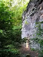 The next layer is Cleveland shale. This is a black shale that is an important source of local fossils. Again Cleveland shale is not visible on Gildersleeve Mountain but can easily be found in the nearby Chagrin River valley between 800 and 900 feet (270 m) msl.