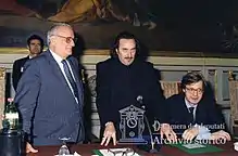 De Dominicis first appearance in the Venice Biennale was in 1972, the exhibition curated by Francesco Arcangeli, Renato Barilli and Marco Valsecchi juxtaposed traditional paintings with more experimental expressions such as performance art. In these terms, “behaviour”– or even “attitude” – became synonymous with those practices using the body, creating ephemeral installations as well as stimulating a more participatory response by the public. During the first day of the vernissage, the presence of a seated man with Down's Syndrome in a corner of room 26, whose name was Paolo Rosa, attracted a lot of attention and violent criticism. After less than an hour, De Dominicis was forced to replace him with a little girl and then to close the room. Despite his very short exposure, the Second Solution of Immortality is generally identified and linked with Paolo Rosa, due also to the attention given to the incident by very influential voices. The headline of the article by Pier Paolo Pasolini, dated 25 June 1972, in the newspaper Il Tempo. Pasolini suggested that the act of De Dominicis was a product of Italian subculture. Three years later, in 1975, the event was even referred to by poet Eugenio Montale, in his Nobel Lecture entitled "Is Poetry still Possible?", with the following words : At the great exhibition in Venice years ago the portrait of a mongoloid was displayed : the subject was très dégoutant, but why not ? Art can justify everything. Except that upon approaching it, one discovered that it wasnot a portrait but the unfortunate man himself, in flesh and blood. The experiment was then interrupted by force, but in a strictly theoretical context it was completely justified. For many years art critics with university chairs had preached the absolute necessity of the death of art, waiting for who knows what palingenesis or resurrection, of which there was no sign. What conclusion can be drawn from all this ? Evidently the arts, all the visual arts, are becoming more democratic in the worst sense of the word. Art is the production of objects for consumption, to be used and discarded while waiting for a new world in which man will have succeeded in freeing himselfof everything, even of his own consciousness. The example I cite could be extended to the exclusively noisy and undifferentiated music listened to in those places where millions of young people gather to exorcize the horror of their solitude. But why more than ever has civilized man reached the point of feeling horror even of himself? In 1993 he announced that his tempera-and-gold-on-panel paintings could not be considered for Biennale prizes; in 1995 he publicly declined to appear at all.