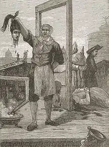 ![]() Mastro Titta offering snuff to a condemned prisoner before carrying out an execution. From a 19th-century woodcut. | |