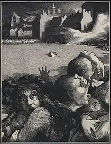 Combaz further designed book covers and postcards. Particularly well known are his postcards with designs of the four elements, scenes of the ocean and fishermen, expressions and proverbs. He further created a number of drawings that expressed the horror of the Belgians at the atrocities committed by the German occupiers during the First World War. One of his drawings called Louvain shows the terror of the citizens of Louvain at the burning down of their town by German soldiers on 25 August 1914. Combaz depicted in very graphic detail the horrified people fleeing the town with flames visible in the background of the drawing.[6]