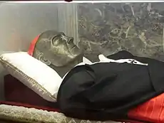 Dusmet died on 4 April 1894 at around 10:30pm and was buried in the chapel of the Confraternita dei Bianci at a funeral on 6 April that started at 10:00am and ended with his burial at 4:30pm.[2] He had fallen ill at the beginning of 1894 and on 2 April left instructions not to be embalmed and to have a simple funeral. On 4 April attempts at artificial respiration were stopped when doctors said that Dusmet's death was imminent. His final words echoed that of Jesus Christ: "it is finished". His relics were later translated to the Catania Cathedral in May 1904.[1] Cardinal Alfredo Ildefonso Schuster - future Blessed and a Benedictine himself - unveiled a monument dedicated to Dusmet in Catania in 1935.