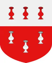 ![]() 1715 -- Arms for the House of Giusti in argent on gules, six weights in the form of vases without handles from one to the other, 3 by 3. |