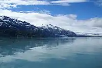 The Johns Hopkins Glacier rises from the Fairweather Range on the east slopes of Lituya Mountain and Mount Salisbury and has an easterly flow towards the head of Johns Hopkins Inlet, 1 mile (1.6 km) southwest of the terminus of Clark Glacier and 79 miles (127 km) northwest of Hoonah. Its rock, ice and snow depict a variety of impressive colors such as grey, blue and white. It was named in 1893 by H.F. Reid after the Johns Hopkins University in Baltimore, Maryland, which sponsored an expedition to this glacier. It is the only advancing tidewater glacier now (its advance started in 1924 when Grand Pacific Glacier started receding towards Tarr Inlet) and is combined with Gilman Glacier (first got attached to Hopkins in the 1990s, broke off and rejoined several times and once again it appears joined since 2000); both are advancing as one single ice block, and at the waterfront, has a width of 1 mile (1.6 km) with a depth of 250 feet (76 m), rises to a height of 250 feet (76 m) and stretches to about 12 miles (19 km) upstream. Submarine calving has also been recorded.[16][26]