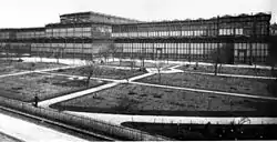 The two-storied building was 234 meters (768 ft) long, 67 meters (220 ft) wide and 25 meters (82 ft) high. The elongated rectangular glass palace, in the form of a five-nave and two-storey main building in the hall with a transept in the middle and rectangular extensions at the ends of the longitudinal ship had a length of 234 meters and was 67 meters wide; the height was 25 meters.