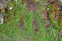 They are said to be the footprints of Finlay Munro, otherwise known as the Highland Evangelist, a native of Tain.[3] After a productive ministry on the Isle of Lewis, he made a tour of the southern Highlands during which he preached in Glenmoriston in 1827. His sermon, on the text "Prepare to meet thy God, O Israel" (Amos 4:12), was generally well received but some Catholics from Glengarry heckled him, calling him "a cheat and a liar"[4] Munro is supposed to have closed his Bible and retorted that the ground on which he stood would bear witness to the truth of what he said until the Day of Judgement comes. Thus the marks on the ground are said to be his footprints, where nothing will grow.