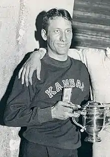 Cunningham won the Sullivan medal in 1933 for his achievements in middle-distance running. In 1934, he set the world record for the mile run at 4:06.8, which stood for three years. He also set world records in the 800 m in 1936 and in the indoor mile in 1938.[2][5] Also in 1938, Cunningham set a personal best time in the mile run at 4:04.4 testing Dartmouth College's Alumni Gymnasium indoor track, engineered to allow faster times than most indoor facilities. This time was not accepted as a world record, however, because Dartmouth had provided Cunningham pacing runners, which was against the rules at the time.[6]