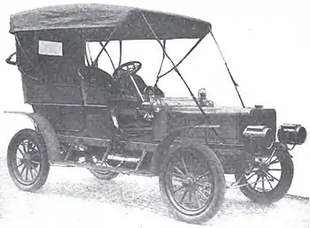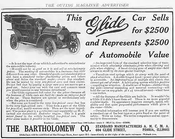 In 1901 Batholomew began experimenting with automobile manufacturing, and in 1902 he added automobiles to the Bartholomew Company production line. Their slogan was "Ride in a Glide, Then Decide."[3]: 629 They made a total of seven models, though never more than 500 cars in a year, and usually less.[3]: 629 The first car was a 6 hp (4.5 kW) single-cylinder tiller-steered runabout named the Glidemobile. By 1904, they had added a steering wheel and increased the engine to 8 hp (6.0 kW). The engine was positioned horizontally under the seat, featured a single chain-drive and an optional tonneau top. The two-seater sold for US$750, and the tonneau top for US$850. About 25 were sold in 1903 and twice that in 1904.