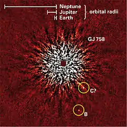 In November 2009, a team using the HiCIAO instrument of the Subaru Telescope imaged a substellar companion orbiting the star. This object, designated Gliese 758 B, was estimated to be of approximately 10 to 40 Jupiter masses. A second candidate object was also detected, which was given the designation Gliese 758 C.[10][11] Follow-up studies of the system suggested the mass range of Gliese 758 B, indicating it to be a companion with approximately 30 to 40 Jupiter masses and revealed that Gliese 758 C is a background star which is not physically associated with the Gliese 758 system.[12] On the other hand, a younger age was suggested from the kinematic stellar grouping.