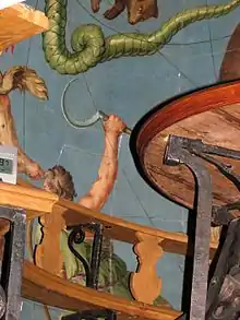 In line with contemporary taste, the celestial sphere was colourful and with elaborate figures for the constellations. Stars were represented by eight-pointed nail heads of gilded brass. These were grouped into the traditional six magnitudes to illustrate the actual brightness differences of the stars. Two candles on the table made the stars twinkle. Along the ecliptic, on the celestial sphere, moved a cog on which was mounted a model of the Sun made of cut crystal. This exhibited both the daily motion of sunrise and sunset and the annual movement, the seasonal change of rise and set points and of the Sun's maximum altitude. A meridian semicircle above the observer had a degree scale. It was not possible to display the complex movement of Moon or planets with the Globe.[6]