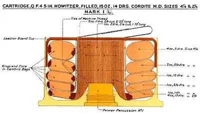 Howitzer cartridges, both BL and separate QF, contained a central core of cordite surrounded by several stacked bags in the shape of rings, containing cordite. To obtain the appropriate "charge" for the required range and angle of elevation, the gunner removed and discarded one or more rings before loading.