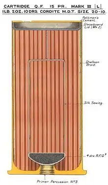 - In BL artillery terminology, cartridge referred to the propellant unit only - there was no case. British cartridges up to approximately 1892 contained gunpowder, and thereafter sticks of cordite bound up together with an igniter pad if necessary, in a cloth bag, usually silk. The "stick" nature of cordite gave the cartridges a degree of rigidity and hence they retained a tubular shape and could be handled and loaded as a solid unit even without a case. With BL, cordite is contained in one or more cloth bags joined together. The complete unit is termed a cartridge. The empty bag was termed an "empty cartridge".[7]