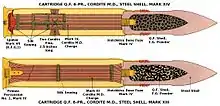 Early shells had walls of the same thickness for the whole length, later shells had walls thicker at the base and thinning towards the nose. This was found to give greater strength and provide more space for explosive.[12] Later shells had 4 c.r. heads, more pointed and hence streamlined than earlier 2 c.r.h. designs.