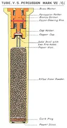 Usually abbreviated to "V.S. tube" or just tube. This was the traditional, reliable British method of fully igniting powder charges in BL guns to fire projectiles, especially large shells. Briefly, after the powder cartridge was loaded (or even during the loading process), the tube was inserted through a vent in the breech. Early vents were "radial" i.e. at right-angles to the barrel length, bored through the top of the barrel into the chamber; later vents were "axial" through the centre of the breech mechanism and "mushroom" into the chamber. When the breech was closed, one of several methods was then used to trigger the tube, which then sent a powerful flash into the breech. The flash ignited a special "igniter" material in the end of the cartridge, and the igniter in turn ignited the main propellant charge (some form of gunpowder or cordite). A powerful reliable flash from the tube was required because with bag charges, especially in the stress of combat or with variable howitzer charges, it could not be guaranteed that the igniter in the cartridge would be up close to the vent – it may have been pushed in too far, leaving a gap. The tube was designed to expand on ignition and seal the vent, preventing escape of gas. Tube types: