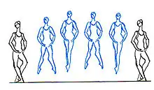 (French pronunciation: [atityd]) A position in which a dancer stands on one leg (the supporting leg) while the other leg (working leg) is raised and turned out with knee bent to form an angle of approximately 90° between the thigh and the lower leg. The height of the knee versus the foot and the angle of the knee flexion will vary depending on the techniques. The working leg can be held behind (derrière), in front (devant), or to the side (à la seconde) of the body. The alignment of the thigh compared to the midline in Attitude derrière will vary depending on the techniques. The foot of the supporting leg may be flat on the floor, en demi-pointe (ball of the foot), or en pointe (tips of the toes). The standing leg can be straight or bent ("fondu").
