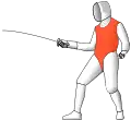 A sabre fencer. Valid target (everything from the waist up, including the arms and head) is in red.