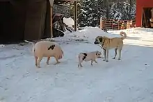 The Gloucestershire Old Spots (also "Gloucester, Gloucester Old Spot, Gloucestershire Old Spot"[2] or simply "Old Spots"[3]) is an English breed of pig which is predominantly white with black spots. It is named after the county of Gloucestershire. The Gloucestershire Old Spots pig is known for its docility, intelligence, prolificity, and hardiness.[4] Boars reach a mature weight of 600 lb (272 kg) and sows 500 lb (227 kg). The pigs are white with clearly defined black (not blue) spots. There must be at least one spot on the body to be accepted in the registry. The breed's maternal skills enable it to raise large litters of piglets on pasture. Its disposition and self‑sufficiency should make it attractive for farmers raising pasture pigs and those who want to add pigs to diversified operations.