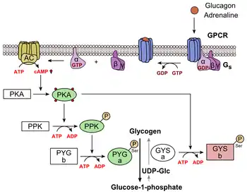 Glucagon binds to the glucagon receptor, a G protein-coupled receptor, located in the plasma membrane. The conformation change in the receptor activates G proteins, a heterotrimeric protein with α, β, and γ subunits. When the G protein interacts with the receptor, it undergoes a conformational change that results in the replacement of the GDP molecule that was bound to the α subunit with a GTP molecule. This substitution results in the releasing of the α subunit from the β and γ subunits. The alpha subunit specifically activates the next enzyme in the cascade, adenylate cyclase.[22]