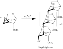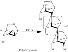 The first representatives of main chain unhydrolysable linear polymers made up of levoglucosan units were synthesized in 1985 by anionic polymerization of 2,3-epoxy derivatives of levoglucosan (1,6;2,3-dianhydro-4-O-alkyl-β-D-mannopyranoses).[2]
