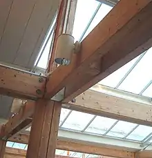 By laminating a number of smaller pieces of lumber, a single large, strong, structural member is manufactured from smaller pieces. These structural members are used as vertical columns, horizontal beams, and arches. Glulams are readily produced in curved shapes and are available in a range of species and appearances.[1] Connections are usually made with bolts or steel dowels and steel plates.