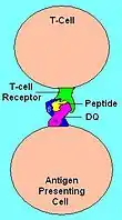 | Illustration of HLA-DQ with peptide in the binding pocket | HLA DQ Receptor with bound peptide and TCR |