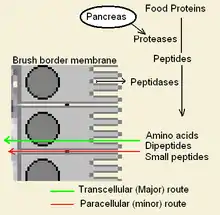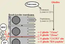 Some alpha gliadin have other direct-acting properties. Other gliadin peptides, one in a glutamine rich region and another peptide, "QVLQQSTYQLLQELCCQHLW", bind a chemoattractant receptor, CXCR3. Gliadin binds to, blocks and displaces a factor, I-TAC, that binds this receptor.[2] In the process it recruits more CXCR3 receptor, increases MyD88 and Zonulin expression.[1][9] The factor it displaces, I-TAC, is a T-cell attractant. This peptide may also be involved in increased risk for type 1 diabetes as zonulin production is also a factor.[10] This triggering of zonulin ultimately results in the degradation of tight junctions allowing large solutes, such as proteolytic resistant gliadin fragments to enter behind the brush border membrane cells.