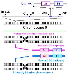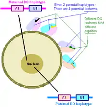 The major gluten proteins that are involved in coeliac disease are the α-gliadin isoforms. Alpha gliadin is composed of repeated motifs that, when digested, can be presented by HLA-DQ molecules. DQ2.5 recognizes several motifs in gluten proteins, and therefore HLA-DQ can recognize many motifs on each gliadin (see Understanding DQ haplotypes and DQ isoforms on the right)[18] However, numbers of different proteins from the grass tribe Triticeae have been found to carry motifs presented by HLA DQ2.5 and DQ8. Wheat has a large number of these proteins because its genome contains chromosomes derived from two goat grass species and a primitive wheat species.[19][20] The positions of these motifs in different species, strains and isoforms may vary because of insertions and deletions in sequence. There are a large number of wheat variants, and a large number of gliadins in each variant, and thus many potential sites. These proteins once identified and sequenced can be surveyed by sequence homology searches.