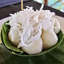 - Klepon - glutinous rice flour balls filled with palm sugar and coated with grated coconut