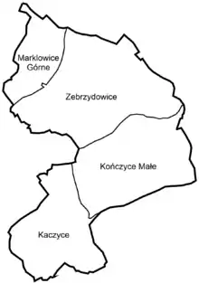 Gmina Zebrzydowice contains the villages and settlements of Zebrzydowice, Kaczyce, Kończyce Małe and Marklowice Górne.