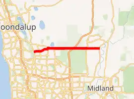 Gnangara Road is an arterial east-west road in Perth, Western Australia. It is located within the northern suburbs of Perth, from Madeley in the west, to Henley Brook in the east. Gnangara Road provides a connection between Great Northern Highway (via West Swan Road) and Wanneroo Road. The construction of the Ocean Reef Road extension in 2011 altered the road network in the Landsdale area in Landsdale.[2] The plans show Gnangara Road as discontinuous between Mirrabooka Avenue and Alexander Drive, with the Mirrabooka Avenue and Ocean Reef Road extensions linking the two sections. Following construction, those linking road sections were named as Gnangara Road, allowing the road to remain continuous.