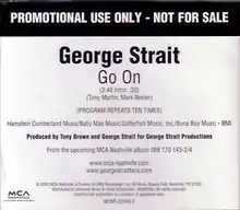 "Go On" is a song written by Mark Nesler and Tony Martin, and recorded by American country music artist George Strait. It was released in July 2000 as the lead-off single from his self-titled album.