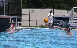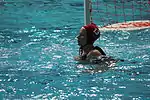 The primary role of the goalkeeper is to block shots at the goal.[25] After saving the ball, the goalkeeper has the responsibility to keep possession of the ball in order to stop opposing players regaining possession.[26] They must make sure that whenever the opposition appears to be ready to make a shot on goal, their hands are near or above the surface of the water.[27] They also possess the job to pass down the pool accurately in order to retain possession of the ball,[28] often starting the team's counterattack.[29]