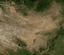 In its broadest definition, the Gobi includes the long stretch of desert extending from the foot of the Pamirs (77° east) to the Greater Khingan Mountains, 116–118° east, on the border of Manchuria; and from the foothills of the Altay, Sayan, and Yablonoi mountain ranges[2] on the north to the Kunlun, Altyn-Tagh, and Qilian mountain ranges, which form the northern edges of the Tibetan Plateau, on the south.[4]