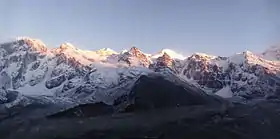 Goecha La (el. 4940 mt or 16,207 ft) is a high mountain pass in Sikkim, India in the Himalaya range. The southeast face of Kanchenjunga, the world's third highest mountain, can be viewed from the pass, which is also a base camp for those aspiring to scale the mountain. They say that when the government authorities first saw the view from Goecha La, they were so moved by the view that they decided to feature it on the Rs.100 note.[1]
