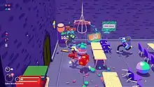 Each of the dungeons is randomly generated, with rooms and enemies in different places every time. The player can find items around each room to use as weapons.[3] Each weapon has a light attack and a heavy attack, and can be thrown. After a certain number of hits, the weapon will break. The player can hold three weapons in their storage at once, and can switch between them at will. The player can find abilities throughout the level, such as being able to do double damage at the beginning of a run. If the player levels up an ability, they can "pin" it, making the player have it by default.[4] The player can additionally find apps that give Jackie a one use ability, like a camera app that stuns enemies with a flash. Players get cash from defeating enemies which can be spent at shops that appear on each floor. The shops contain health items, weapons and new abilities to acquire. At the end of each floor is a boss room where the player has to fight through enemies in order to move down to the next floor. On the fourth floor of the dungeon is a boss the player has to fight in order to obtain the relic. The player is sent back to the hub if their health reaches zero.