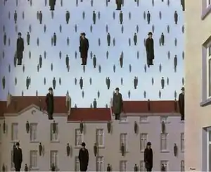 Magritte was fascinated by the seductiveness of images. Ordinarily, you see a picture of something and you believe in it, you are seduced by it; you take its honesty for granted. But Magritte knew that representations of things can lie. These images of men aren't men, just pictures of them, so they don't have to follow any rules. This painting is fun, but it also makes us aware of the falsity of representation.[1]