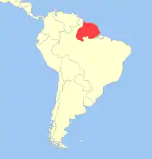 This species is native to wooded areas north of the Amazon River in Brazil, Guyana, French Guiana, Suriname, and possibly Venezuela.[2] A population of tamarins south of the Amazon River that lack the contrasting feet and hands was previously believed to be a sub-population of golden-handed tamarins but is now treated as a separate species, the black tamarin.