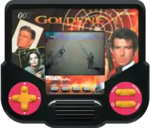 GoldenEye is a third-person shooter handheld electronic game developed and published by Tiger Electronics, based on the 1995 James Bond film of the same name, released between 1995 and 1998.[1] The game was released in two versions, both small handheld dedicated consoles with a similar gameplay: the player controlled James Bond as he fights enemies loosely based on the ones from the film before a GoldenEye satellite destroyed the city (implied to be London) with its electromagnetic pulse weapon.