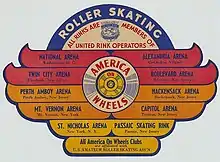 Once national organizations were established to oversee competitions rules, state organizations soon followed. One of the most innovative organizational structures was America on Wheels (AOW). First established in 1941 and operating well into the 1970s, AOW rinks were members of the United Rink Owners association. AOW was a chain of east coast rinks, primarily in New York and New Jersey, that readied competitors through training and regular meets among a group of rinks. At AOW's peak, they numbered 22.[3] The organization managed the rinks while a group of investors sought venues to invest, and in the 1940s, rinks were built in geographic regions that held promise for economic growth. Over time, as both insurance liability costs and real estate values rose, rinks were sold off for better investment opportunities.[3]
