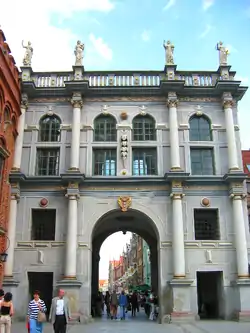 The Golden Gate (Polish: Złota Brama, German: Langgasser Tor) is a historic Renaissance city gate in Gdańsk, Poland. It is located within the Royal Route, the most prominent part of the historic city center and is one of its most notable tourist attractions.