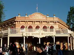 The Golden Horseshoe Saloon (referred to as Pecos Bill's Golden Horseshoe Saloon during construction) is a restaurant and attraction at Disneyland Park in Anaheim, California in the United States. It opened in 1955 with several other original attractions at Disneyland Park. Over the years the venue has housed multiple stage shows; it currently shows "Showdown at the Golden Horseshoe!" seven days a week. The "saloon" is located in Frontierland and has a picturesque view of the Rivers of America, New Orleans Square and part of Critter Country.