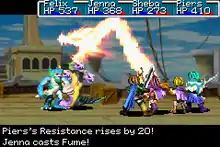 Gameplay in relation to The Lost Age's battle mode is similar to traditional role-playing video games. In each battle, the player is required to defeat all the enemies using direct attacks with weapons, offensive Psynergy spells, and other means of causing damage, all while keeping their own party alive through items and supportive Psynergy that restore life and supplement defense.[7] If all the player's characters are downed by reducing their hit points to zero, the party is returned to the last village that the player visited and suffers a monetary penalty.[7] The successful completion of a battle yields experience points, coins, and occasionally rare items.[8] In addition to the main game itself, there is also a competitive battling mode accessible from the menu screen, where players can enter their teams into an arena to battle increasingly difficult CPU-controlled enemies or other players head-to-head.[9]