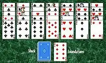 Golf, also known as One Foundation,[1] is a patience or solitaire card game where players try to earn the lowest number of points (as in golf, the sport) over the course of nine deals (or "holes", also borrowing from golf terminology).[2] It has a tableau of 35 face-up cards and a higher ratio of skill to luck than most other solitaire card games.[3] Its easy game-play also makes it within easy reach of first-timers, while still offering scope for strategic play.[4]
