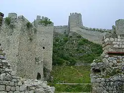 The first known record of Golubac is in Hungarian sources from 1335, when it was occupied by Hungarian military.[9][10] It was described as the "watcher made of stone, guarding the gorge".[8] Sometime between 1345 and 1355, Serbian Tsar Stefan Dušan toured the Braničevo region, which was part of Serbia along the boundary between Serbia and Hungary. He also visited Golubac, which was under the command of Castellan Toma, Voivode of Transylvania, under Hungarian control.[9] After Dušan's death, the House of Rastislalić gained influence in Braničevo, later winning independence. According to Serbian chroniclers, Knez (title) (Count) Lazar of Serbia evicted the last Rastislalić feudal lord, Radič Branković, in 1379, and then presented outlying villages to monasteries in Wallachia.[9]