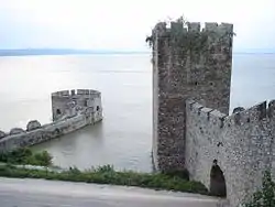 The Golubac Fortress (Serbian: Голубачки град or Golubački grad, Hungarian: Galambóc vára, Bulgarian: Гълъбец, Romanian: Cetatea Golubăț, Turkish: Güvercinlik Kalesi) was a medieval fortified town on the south side of the Danube River, 4 km (2.5 mi) downstream from the modern-day town of Golubac, Serbia. According to recent discoveries, the fortress, which was built during the 14th century by Medieval Serbian state, is split into three compounds which were built in stages.[1] It has ten towers, most of which started square, and several of which received many-sided reinforcements with the advent of firearms. Towers were not connected for easier defense. Also inside the fortress were found Serbian Medieval frescos.[1]