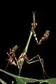 Gongylus gongylodes, also known as the wandering violin mantis, ornate mantis, or Indian rose mantis, is a species of praying mantis in the family Empusidae. Characterized by extremely slender limbs with large appendages, it is not a particularly aggressive species and often kept as a pet by hobbyists. The mantis is especially known for swaying its body back and forth to imitate a stick flowing in the wind.[1] It primarily feeds on flying insects. Its native range is in southern India and Sri Lanka. It can reach up to 11 cm long. The males of the species are capable of flight. This species is a communal species in that they live and breed in large groups without unnecessary cannibalism.