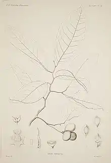 | Botanical illustration of Goniothalamus monospermus (using basionym Richella monosperma) showing leavers, branches, flower parts, fruit and seeds.[1] | |