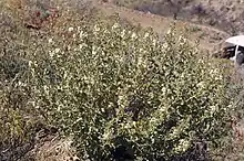 Goodenia chambersii is an ascending shrub that typically grows to a height of 50 cm (20 in) and has somewhat sticky foliage. The leaves are broadly egg-shaped to round, toothed, 15–30 mm (0.59–1.18 in) long and 10–30 mm (0.39–1.18 in) wide on a petiole up to 15 mm (0.59 in) long. The flowers are arranged in racemes or thyrses up to 200 mm (7.9 in) long on a peduncle 2–5 mm (0.079–0.197 in) long with linear bracteoles 5–7 mm (0.20–0.28 in) long at the base, each flower on a pedicel 5–10 mm (0.20–0.39 in) long. The sepals are lance-shaped, 5–6 mm (0.20–0.24 in) long and the petals are yellow and 18–25 mm (0.71–0.98 in) long. The lower lobes of the corolla are about 10 mm (0.39 in) long with wings about 1.5 mm (0.059 in) wide. Flowering occurs from September to October and the fruit is an oval capsule about 12 mm (0.47 in) long.[2][3]