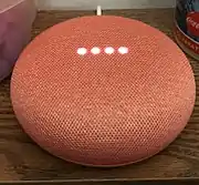 Google unveiled the Google Home Mini during a hardware-focused event on October 4, 2017, which was released on October 19, 2017. It is a variant of Google Home with the same overall functionality, but in a smaller pebble-like form factor around 4 inches (10 cm) in diameter, with a fabric top that its white-colored status lights shine through. It has a mute switch rather than a mute button, and uses a micro USB connection for power. It is available in the colors "aqua", "chalk", "charcoal", and "coral". Analysts compared the Google Home Mini to Amazon's equivalent Echo Dot model.[21][40][41]